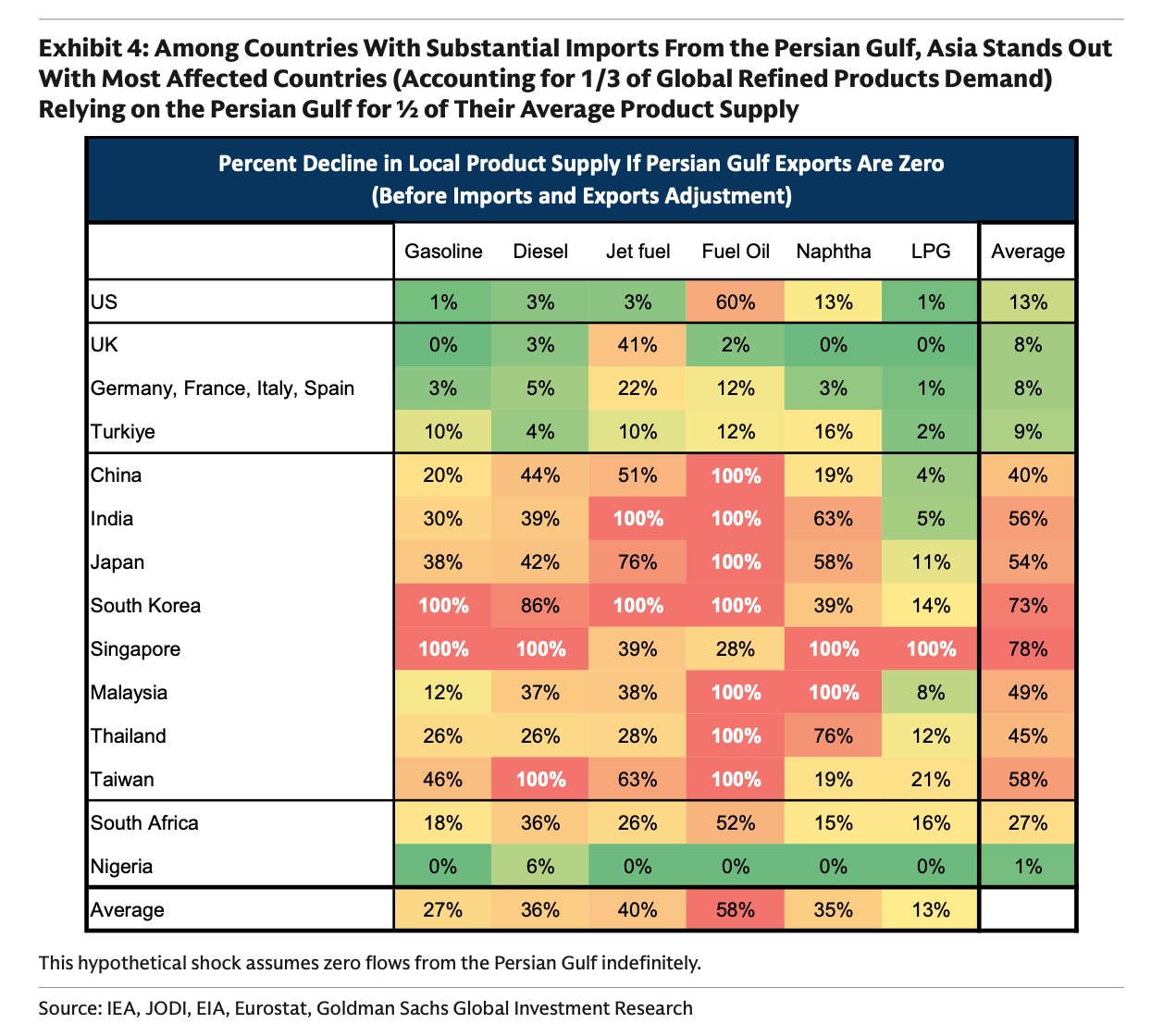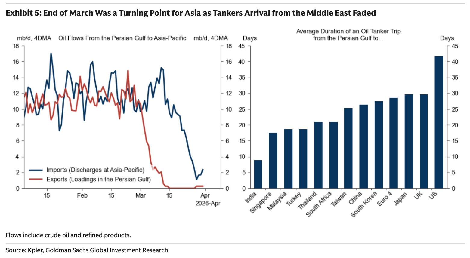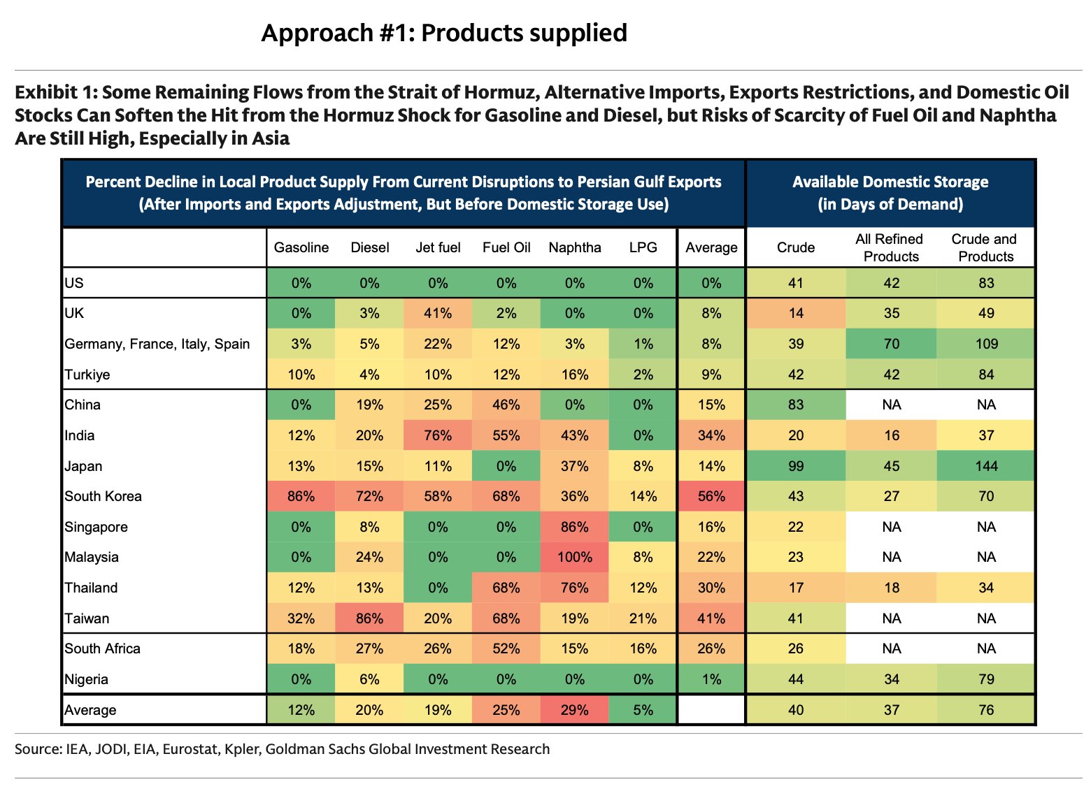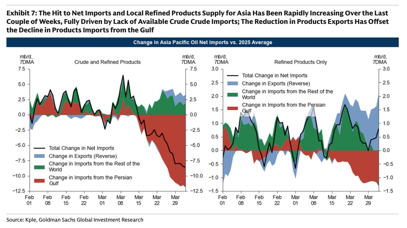 Goldman Sachs v poročilu „Are We Running Out of Oil?“ analizira, ali bo zaradi največjega naftnega šoka v zgodovini (zmanjšanje izvoza iz Perzijskega zaliva za ~16–17 mb/d zaradi blokade Hormuškega preliva) prišlo do resnih pomanjkanj nafte in rafiniranih produktov v bližnji prihodnosti. Analiza je usmerjena v državno- in produktno-specifične trge, pri čemer se osredotoča na Azijo kot najranljivejšo regijo (predstavlja tretjino globalne povpraševanja po rafiniranih naftnih produktih), saj se zadnji tankerji iz predvojnega obdobja izpraznijo aprila 2026.