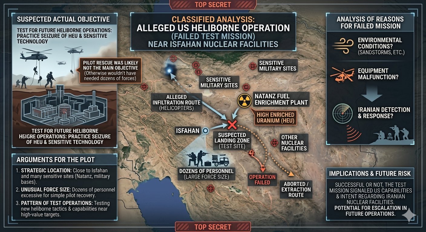 Iranci so s pomočjo umetne inteligence naredili kratek film o ponesrečeni ameriški akciji desanta na iranske jedrske objekte v Isfahanu in ponesrečen poskus vdora in kraje jedrskega materiala. Ameriška akcija se je končala že pri pristanku prvih dveh transportnih letal, ko naj bi Iranci pred pristankom zadeli drugo letalo. Nakar se je začela reševalna akcija za ameriške komandose, ki so ostali na iranskih tleh. V tej reševalni akciji naj bi po poročanju nekaterih medijev sodelovalo celo okrog 150 ameriških zračnih plovil.
