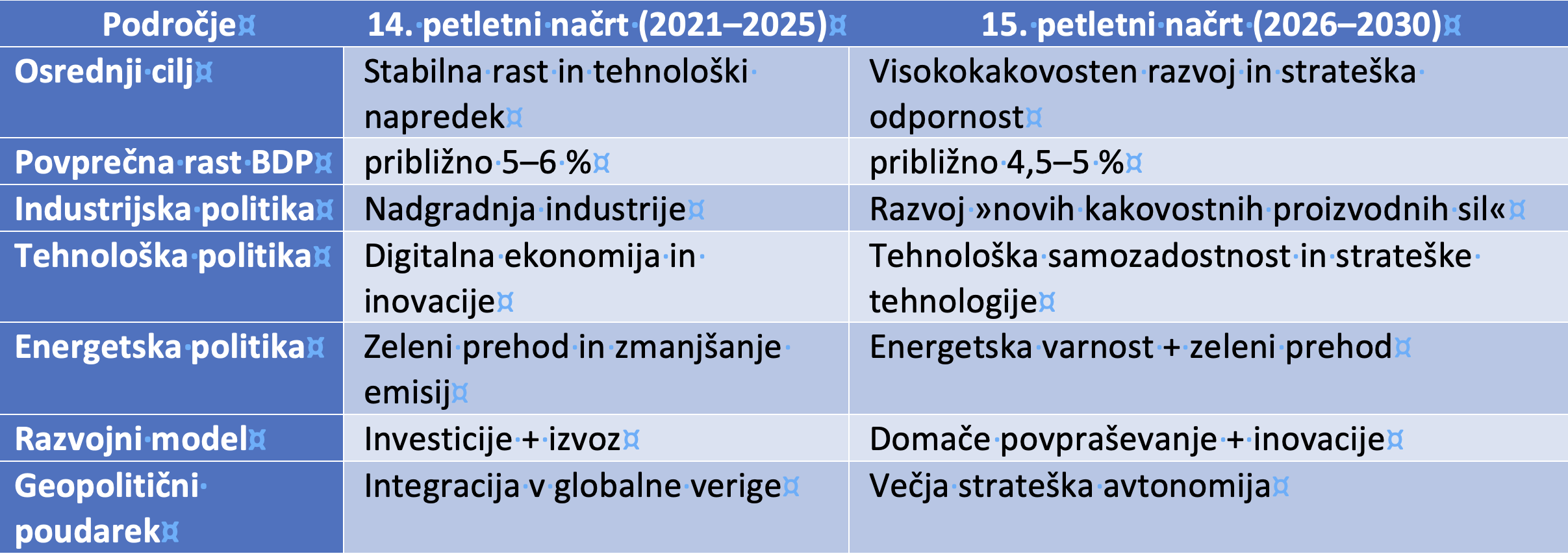 Če so prejšnji petletni načrti predvsem zasledovali visoko gospodarsko rast, je novi načrt izrazito usmerjen v kakovost rasti, tehnološko avtonomijo in gospodarsko odpornost. Poudarek je na razvoju tako imenovanih novih kakovostnih proizvodnih sil, kar pomeni kombinacijo naprednih tehnologij, digitalizacije, inovacijskega sistema in visoko produktivnih industrij. V praksi to pomeni premik od modela, ki je temeljil na investicijah, nepremičninah in izvozu, k modelu, ki naj ga poganjajo tehnologija, domače povpraševanje in zelena transformacija.