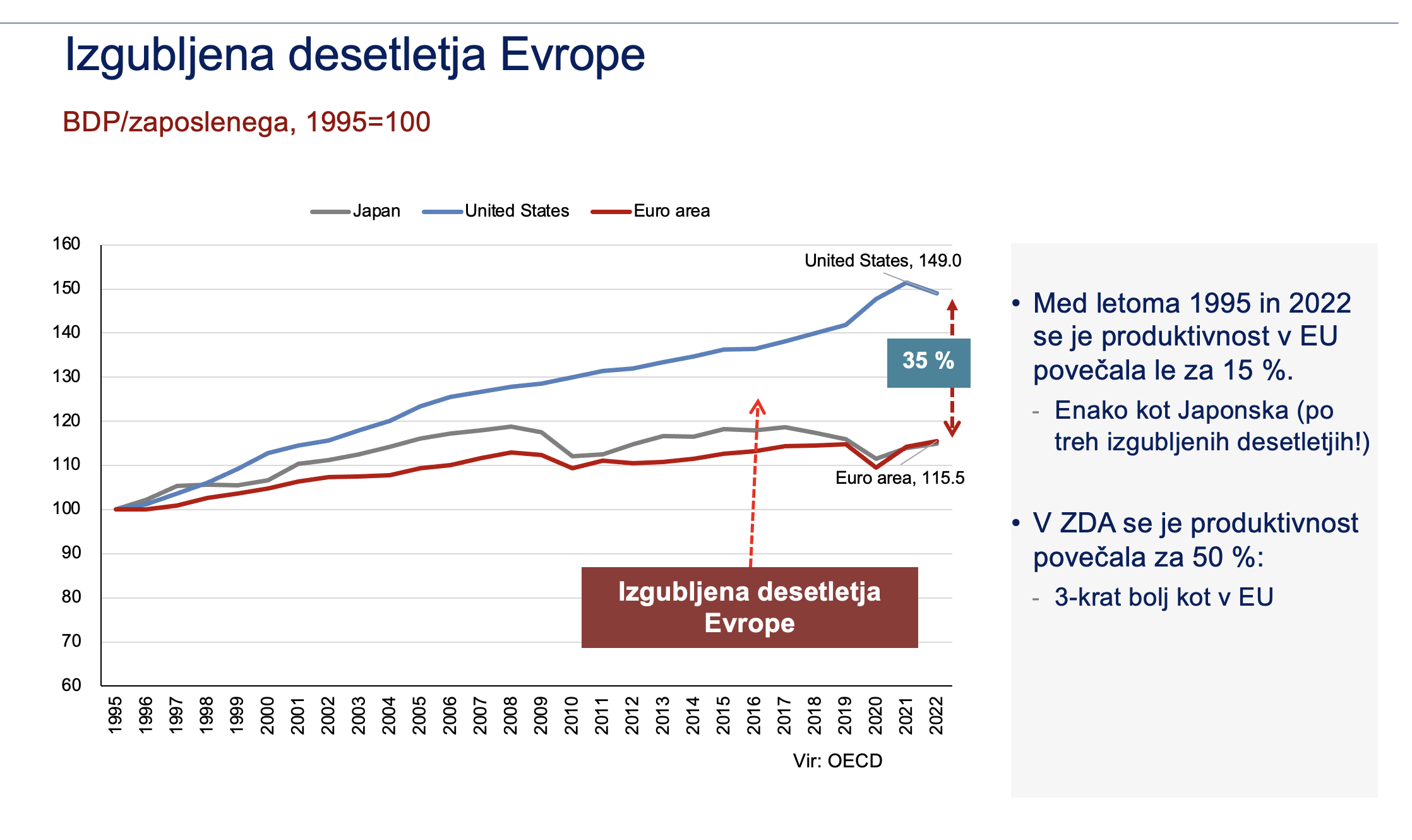 In še huje: evropska produktivnost se je v treh desetletjih povečala natanko toliko kot japonska, ki je že 3 desetletja in pol v gospodarski stagnaciji, ki jo popularno imenujemo “izgubljeno desetletje). In če pogledate zgornji graf, boste videli, da je vse do Covida japonska produktivnost naraščala hitreje od evropske. Če je Japonska v treh desetlejih in pol dolgem obdobju stagnacije (v “izgubljenem desetleju”), je EU v obdobju popolne gospodarske stagnacije. V Dolgi stagnaciji.