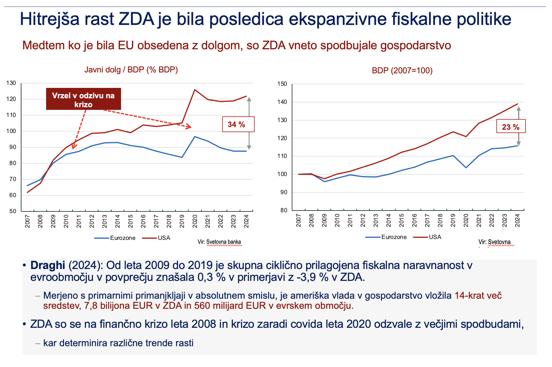 Ta fiskalna “pravovernost” po skupnih evropskih pravilih je nato vodila v dolgo gospodarsko stagnacijo po letu 2009. Kot prikazuje Mario Draghi v Poročilu o konkurenčnosti (2024), je od leta 2009 do 2019 je skupna ciklično prilagojena fiskalna naravnanost v evroobmočju v povprečju znašala 0,3 % v primerjavi z -3,9 % v ZDA. Torej evrske članice so zaradi fiskalnega pravila po veliki finančni krizi vodile restriktivno fiskalno politiko, ZDA pa močno ekspanzivno. Kar pomeni, da je – merjeno s primarnimi primanjkljaji – v desetletju po finančni krizi 2009-2019 v absolutnem smislu ameriška vlada gospodarstvo stimulirala s 14-krat več sredstvi (s 7,8 bilijoni EUR) kot evrske članice, ki so ga v desetletju stimulirale le s 560 milijardami EUR.