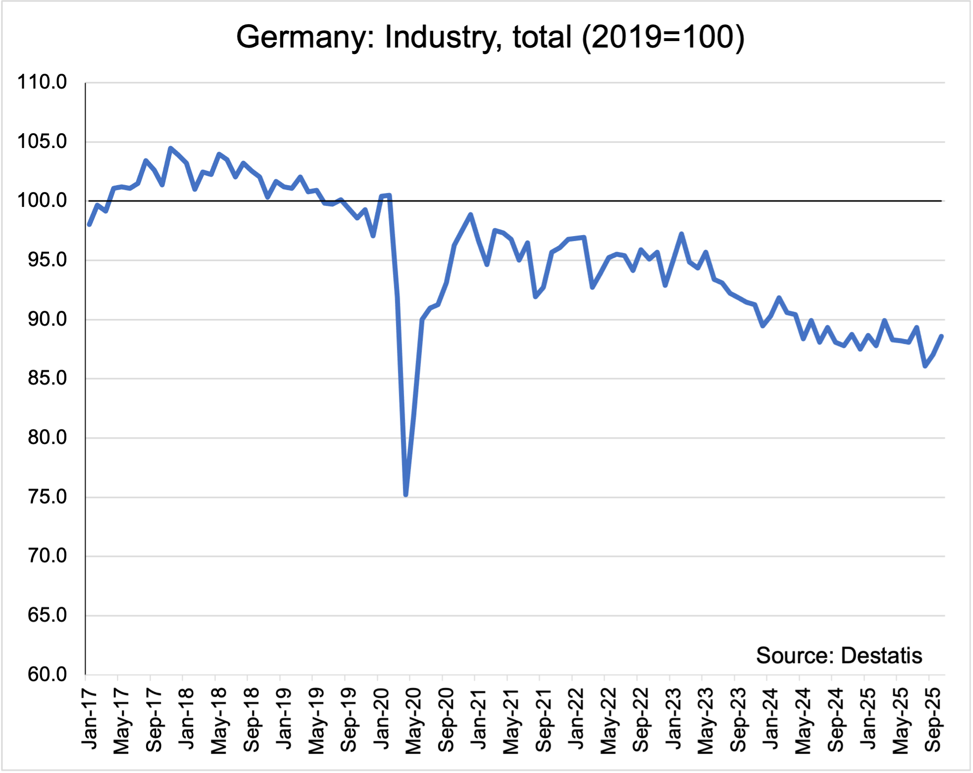 Kratek odgovor: začasno ja, vendar le v primeru popolne militarizacije gospodarstva in dolge vojne, v normalnih časih pa seveda nikakor ne. Nemčija lahko delno pokriva izpad celotne civilne industrije – od kemične do elektro in avtomobilske – s preusmerjanjem javnih sredstev v vojaško industrijo. Toda 50 milijard EUR enkratnih naročil za orožje in vojaško opremo ne pride blizu izpada proizvodnje preostale, civilne industrije. Nemška industrijska proizvodnja je v prostem padu. Obseg industrijske proizvodnje Nemčije je bil leta 2025 v povprečju za 12 % nižji kot v povprečju leta 2019. Nemški obseg industrijske proizvodnje v letu 2024 je znašal 2,900 milijard EUR, 10 % padec pomeni 290 milijard EUR izpada. Torej s proizvodnjo tankov in raket v letu ali dveh (z naročilom v vrednosti 50 milijard EUR) ne samo, da ne moreš nadomestiti letnega izpada civilne industrije, saj vojaška naročila pokrijejo manj kot 10 % izpada skupne industrijske proizvodnje.